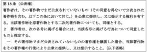 なお、未公表の著作物を原著作物とする二次的著作物(この用語の意味については、いずれ解説します)を公表する場合は、二次的著作物の著作者の公表権に加え、原著作物の著作者の公表権も働きます。